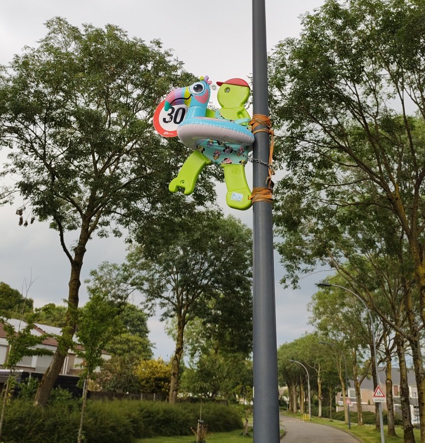 Ook verzorgen wij seizoensgebonden de aankleding van onze 4 Victor-Veilig-poppen die in de palen hangen, om ze telkens weer opnieuw aandacht te geven.